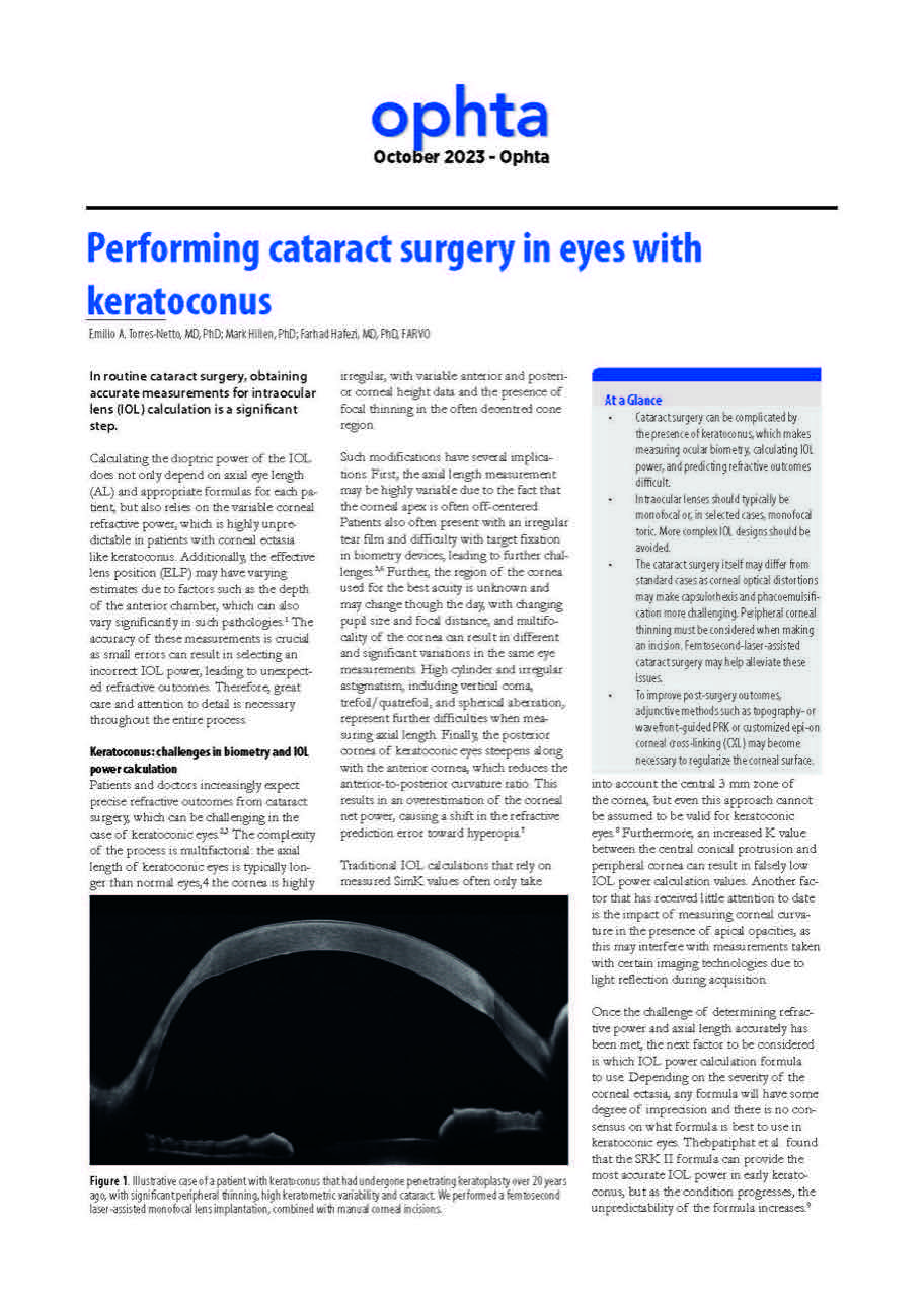 Cataract surgery in patients with keratoconus presents challenges that extend well beyond routine cases. A recent clinical review in ophta by Dr. Emilio Torres-Netto MD, PhD, FEBO, FWCRS, examines how corneal irregularity, altered ocular biometry, and disease stage affect intraocular lens (IOL) calculation, surgical planning, and postoperative outcomes. The article emphasizes that successful cataract surgery in keratoconic eyes requires an individualized, expectation-managed approach rather than reliance on standard workflows.