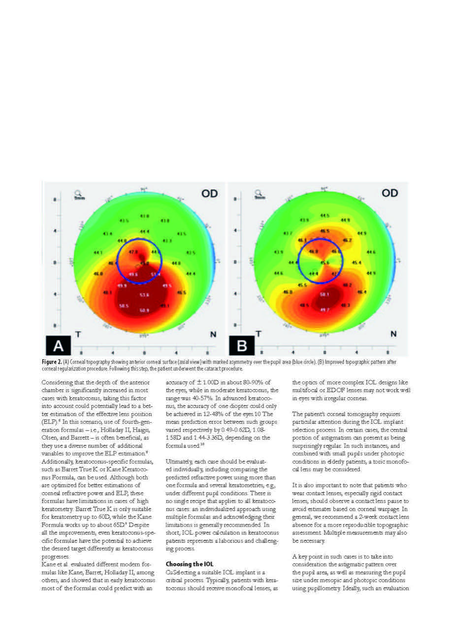 Accurate IOL power calculation is a central difficulty. In keratoconus, corneal refractive power is highly variable and often decentered, while axial length tends to be longer than in normal eyes. Irregular astigmatism, higher-order aberrations, tear film instability, and poor fixation can further compromise biometry reliability. Additionally, posterior corneal steepening alters the anterior–posterior curvature ratio, leading to overestimation of corneal power and a tendency toward postoperative hyperopic error.