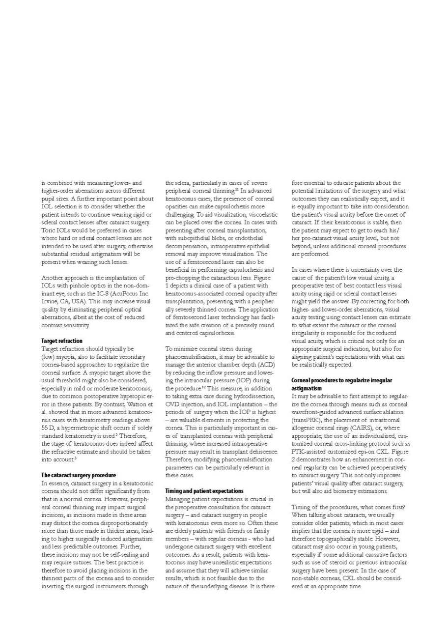 The article highlights the importance of corneal optimization strategies. In selected patients, corneal regularization—using procedures such as wavefront-guided surface ablation, intrastromal allogenic ring segments, or customized corneal cross-linking—may be performed before cataract surgery to improve biometry accuracy and visual outcomes. Timing depends on corneal stability, disease severity, and patient-specific visual goals.