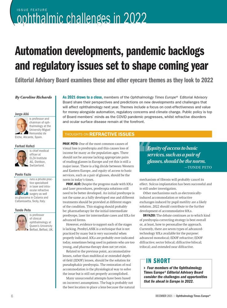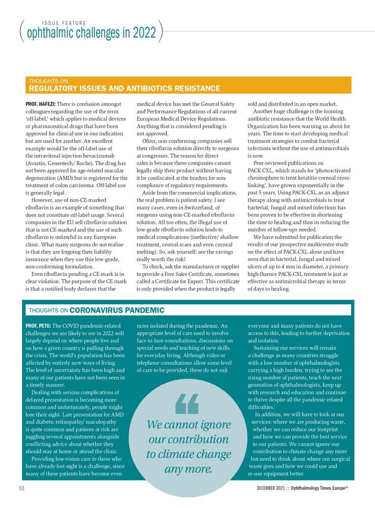 Prof. Hafezi, Mitglied des Redaktionsbeirats von Ophthalmology Time, und seine Meinung zu den "Entwicklungen und Herausforderungen, die die Augenheilkunde im Jahr 2022 beeinflussen werden" in der OT-Ausgabe "Ophthalmic Challenges in 2022". Prof. Hafezi erörterte alles von der künstlichen Intelligenz bis zur Antibiotikaresistenz und deckte darüber hinaus Themen wie Hornhautvernetzung und Augenoberflächenerkrankungen.