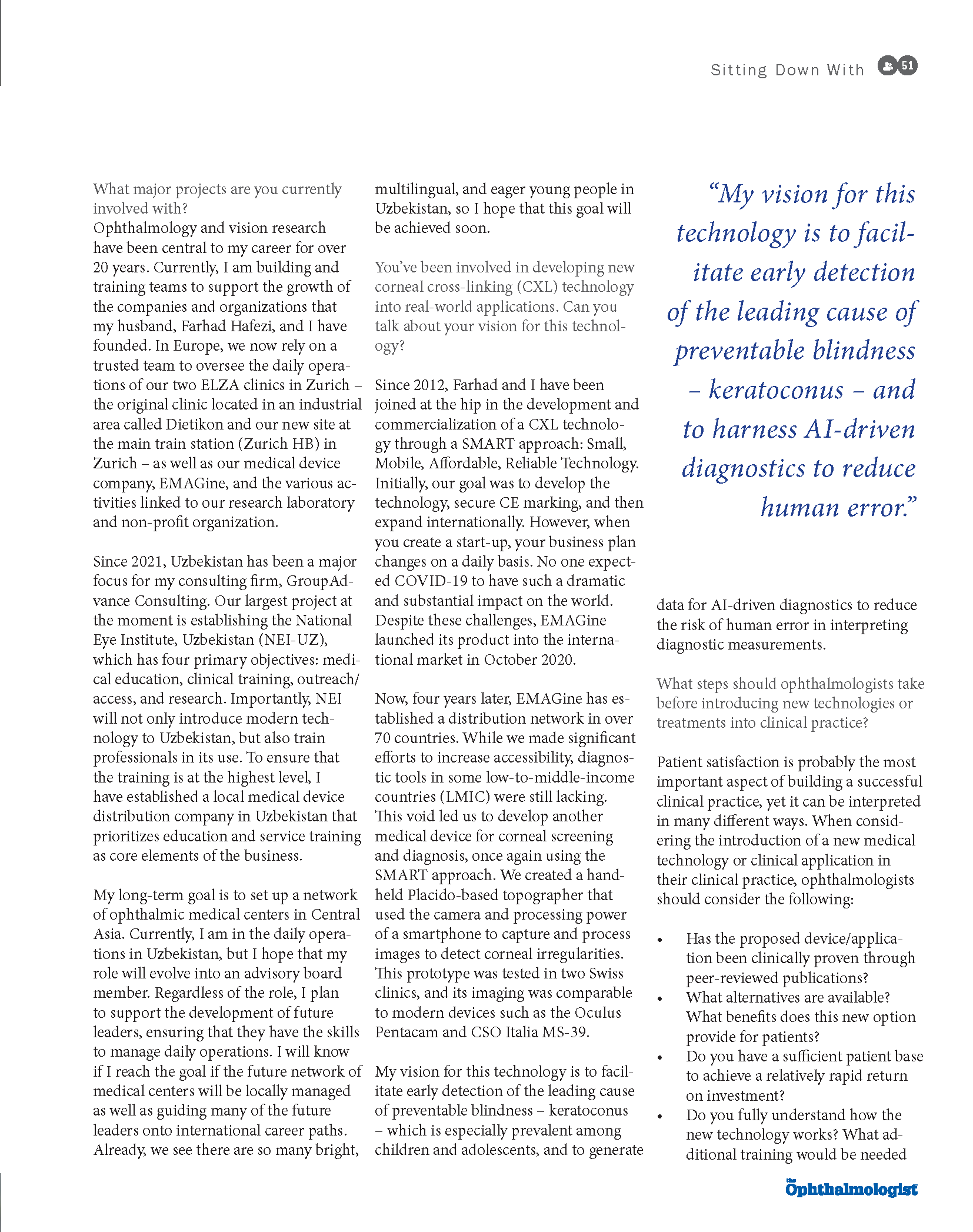 Innovation in der Augenheilkunde findet zunehmend an der Schnittstelle von klinischer Wissenschaft, Technologieentwicklung und Gestaltung von Gesundheitssystemen statt. In ihrem kürzlich erschienenen Artikel “Scanning the Eye Care Horizon”, der “Sitting Down With”-Interview in Der Ophthalmologe, Nikki Kristoffersen-Hafezi, Mitbegründer und CEO von EMAGine AG und ELZA Institut AG, überlegt, wie diese Bereiche aufeinander abgestimmt werden können, um den Zugang zu einer evidenzbasierten Augenheilkunde zu verbessern.