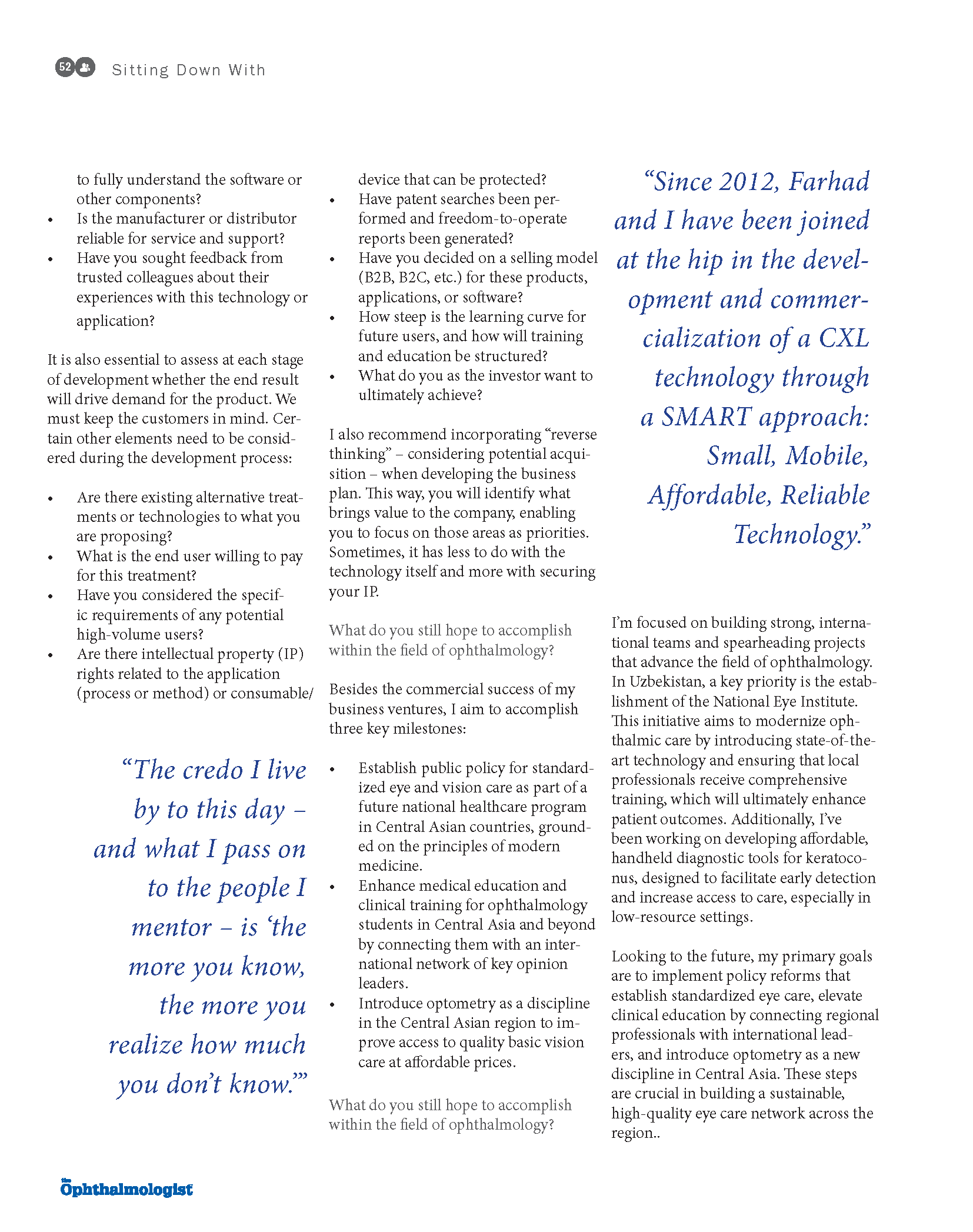 Die Technologieentwicklung wird am Beispiel dem Corneal Crosslinking (CXL) behandelt. Seit 2012 ist Kristoffersen-Hafezi eng an der Umsetzung von CXL-Konzepten in einsatzfähige klinische Plattformen beteiligt, wobei sie einen “SMART”-Ansatz verfolgt - klein, mobil, erschwinglich und zuverlässig. Dieser Ansatz bildet die Grundlage für die Entwicklung des EMAGine C-eye-Gerätes und, in jüngerer Zeit, eines tragbaren Placido-basierten Hornhaut-Screening-Tools, das die Hardware eines Smartphones nutzt. Frühe klinische Tests haben gezeigt, dass die Bildgebungsleistung mit der etablierter Diagnoseplattformen vergleichbar ist, was ihre potenzielle Rolle in dezentralen Screening-Umgebungen unterstützt.