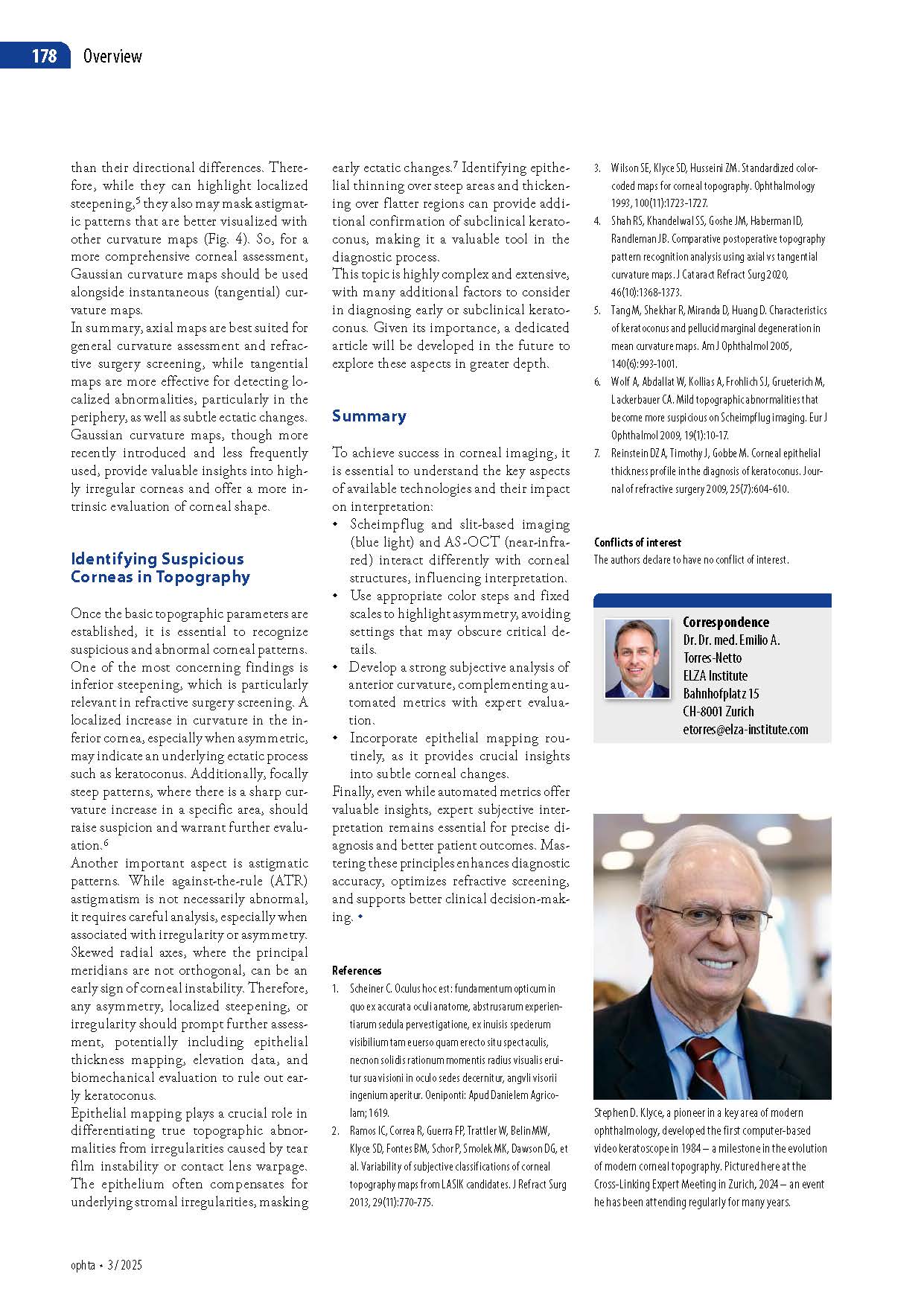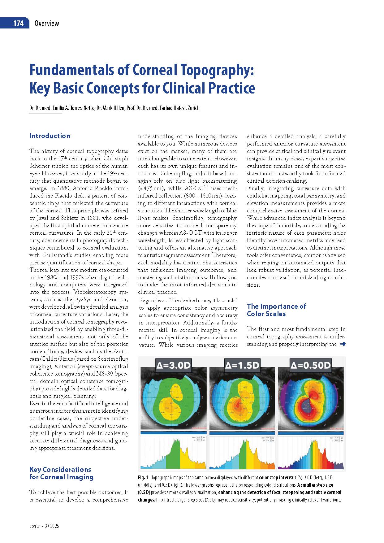 Corneal topography has undergone remarkable technological evolution, yet its clinical value still depends heavily on how images are interpreted. In a recent overview published in ophta (3/2025), Torres-Netto, Hillen, and Hafezi revisit the fundamental principles of corneal topography and tomography, emphasizing that accurate diagnosis begins not with advanced indices, but with correct interpretation of basic maps