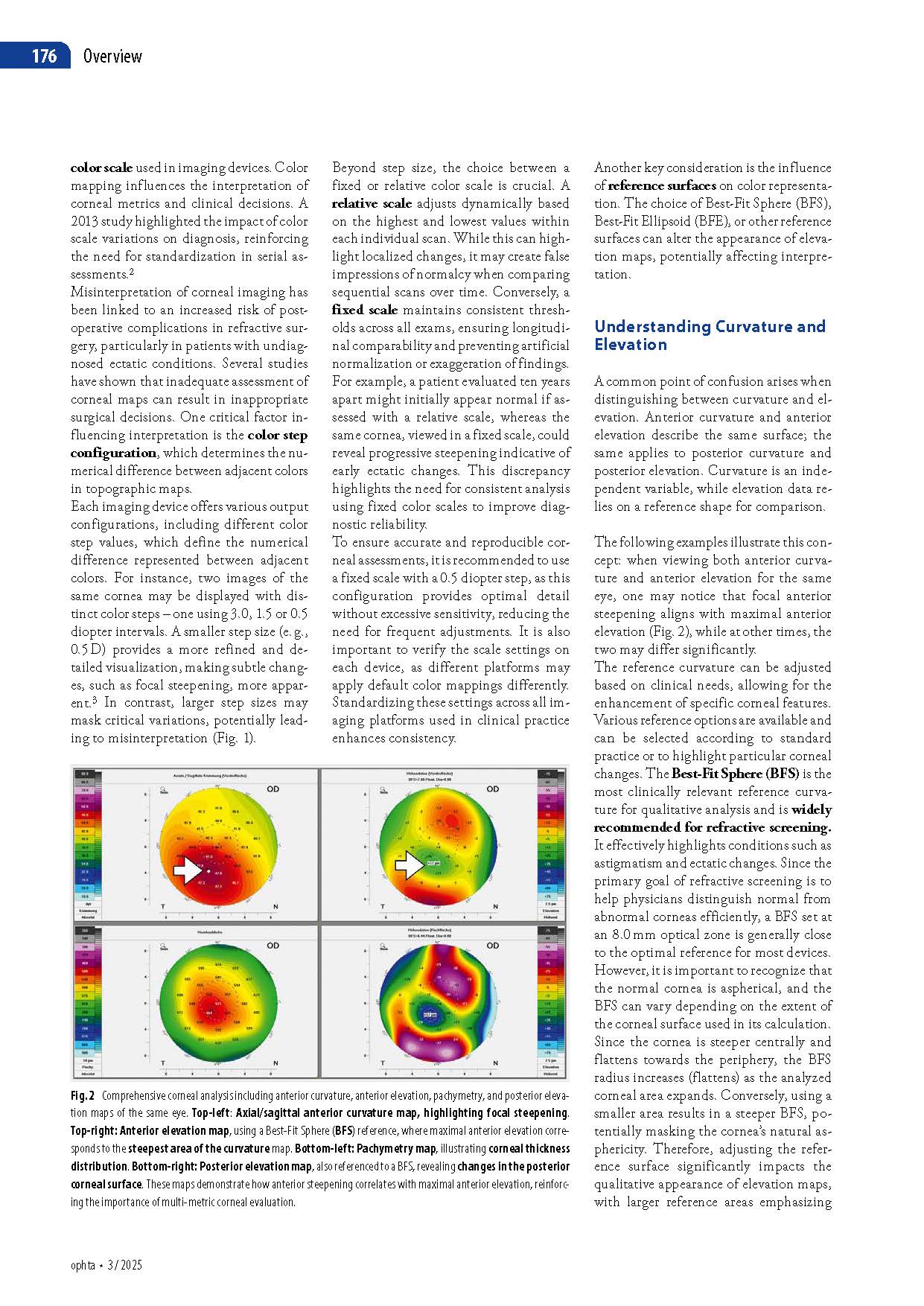 The article also clarifies the often-confused relationship between curvature and elevation. Although they describe the same corneal surface, elevation maps depend on the chosen reference shape, such as a best-fit sphere or ellipsoid. Changes in reference diameter or geometry can significantly alter map appearance, underlining the importance of consistency when monitoring patients over time.