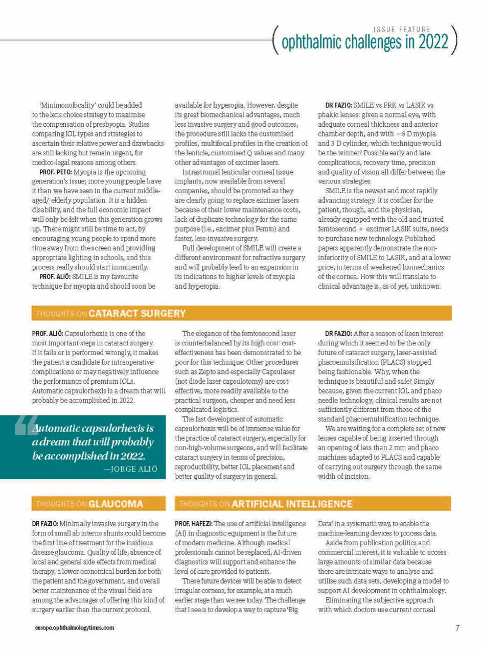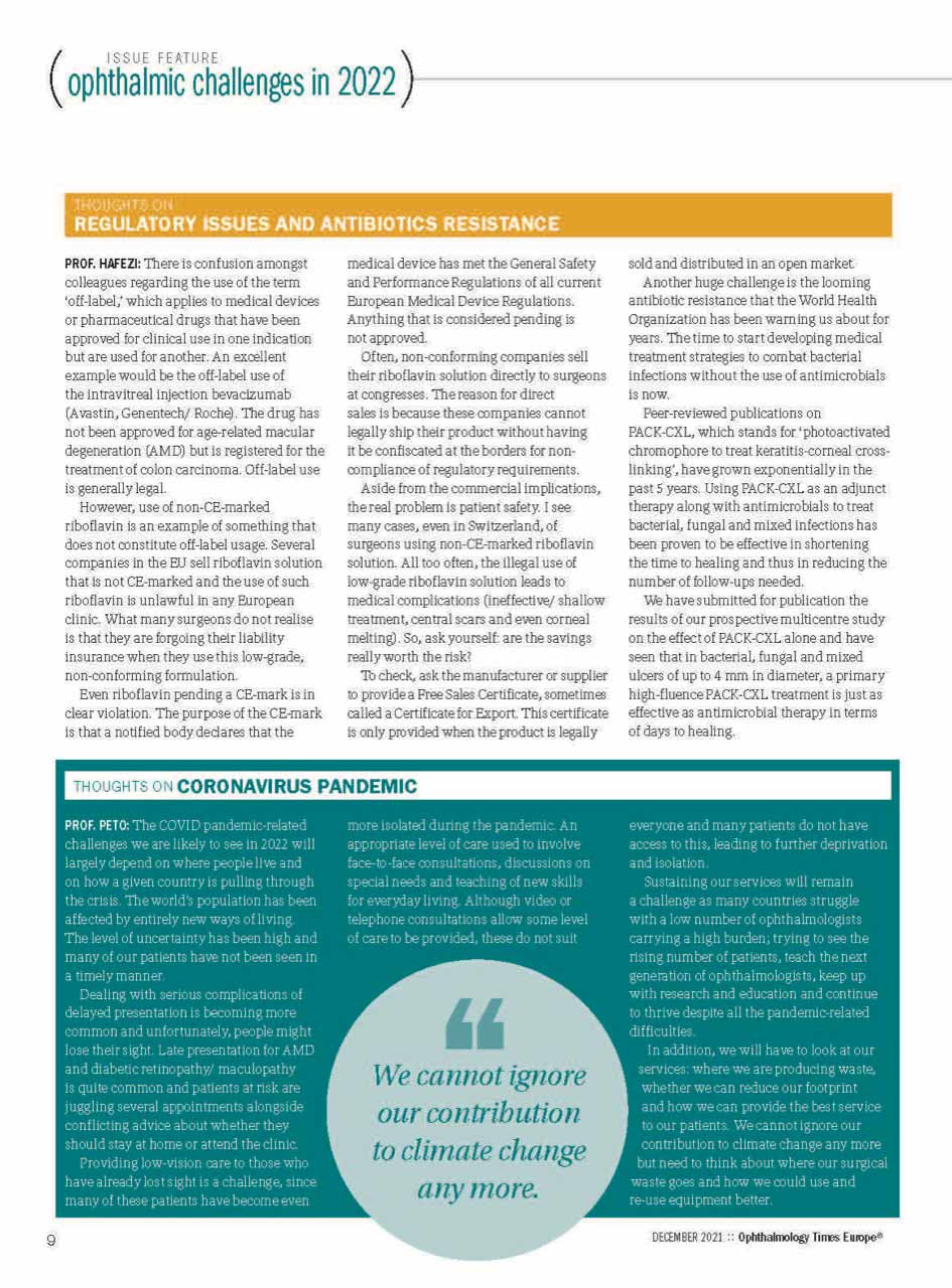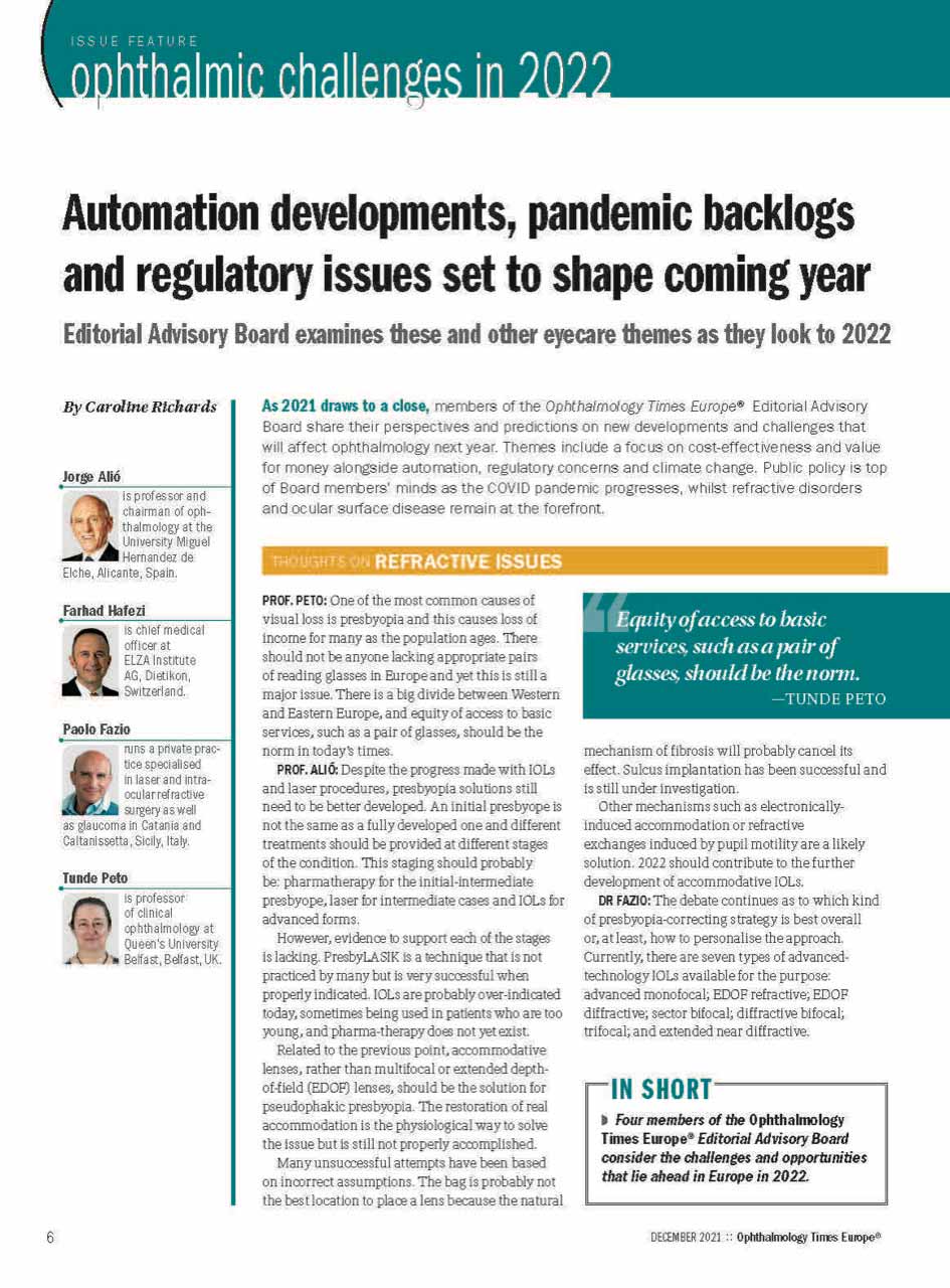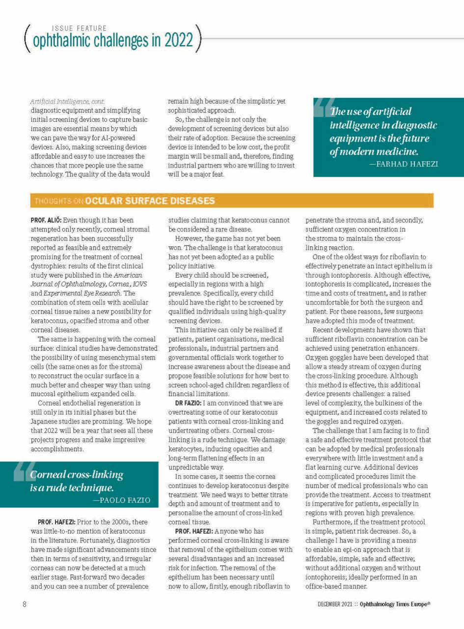 A edição de dezembro de 2021 da Ophthalmology Times Europa destaca a evolução dos desafios clínicos que a oftalmologia enfrenta à medida que a área entra num novo ano. Entre os principais tópicos apresentados na capa está “Otimização da função visual no ceratocone”, reflectindo o interesse clínico e científico sustentado em melhorar os resultados para além da mera estabilização da doença.