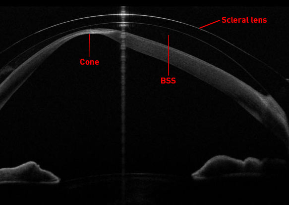 For those unfamiliar, scleral lenses are a type of contact lens that vaults over the cornea and rests on the white part of the eye (the sclera). The lens is filled with sterile BSS solution, which fills the space between the cornea and the lens. This makes scleral lenses particularly beneficial for those with irregular corneas, such as our patient with keratoconus, as the multitude of small irregularities on the surface of the cornea that cause the visual disturbances and higher order aberrations become filled with the fluid, and as a side benefit, is extremely good at treating severe dry eye too. At ELZA, our Senior Optometrist, Léonard Kollros, is a highly experienced, expert scleral lens fitter, and the case we report here is one of his.